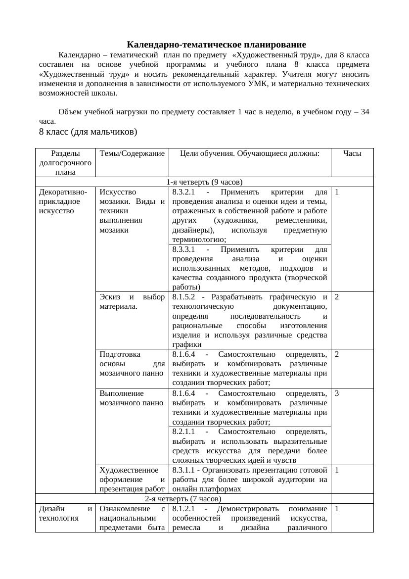 КТП 8 класс по предмету «Художественный труд» мальчики-1